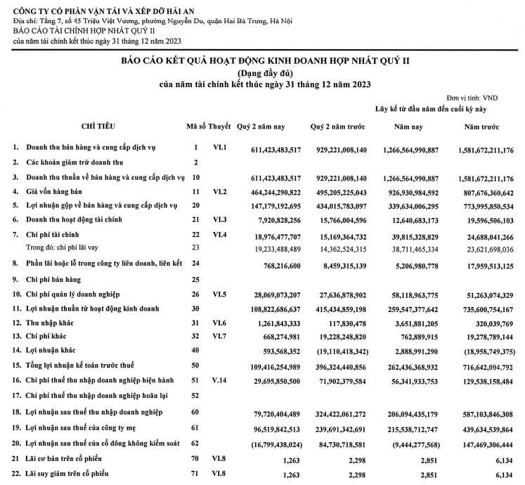 Công ty cổ phần Vận tải và Xếp dỡ Hải An (mã ck: HAH) vừa công bố báo cáo tài chính quý II/2023.