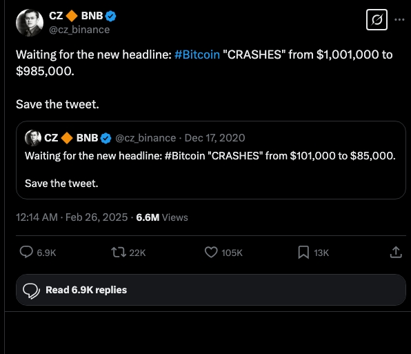 Trong dòng tweet mới nhất, CZ đã chia sẻ lại quan điểm của mình với một lời nhắn đầy ẩn ý: "Chờ tiêu đề mới: Bitcoin ‘lao dốc’ từ 1.001.000 USD xuống 985.000 USD. Hãy lưu lại tweet này." Dòng tweet này gợi nhớ đến một tuyên bố tương tự mà ông từng đưa ra vào năm 2020, khi Bitcoin còn ở mức giá thấp hơn nhiều so với hiện nay. Khi đó, CZ đã dự đoán rằng các tiêu đề báo chí thường phóng đại sự sụt giảm của Bitcoin, ngay cả khi đồng tiền này đạt những đỉnh giá lịch sử.