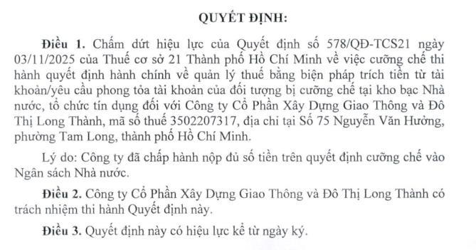 Quyết định nêu rõ việc chấm dứt hiệu lực của Quyết định số 578/QĐ-TCS21 ngày 3/11/2025 của Thuế cơ sở 21 Thành phố Hồ Chí Minh về việc cưỡng chế thi hành quyết định hành chính về quản lý thuế bằng biện pháp trích tiền từ tài khoản/yêu cầu phong tỏa tài khoản của đối tượng bị cưỡng chế tại kho bạc Nhà nước, tổ chức tín dụng với Công ty cổ phần Xây dựng Giao thông và Đô thị Long Thành, có địa chỉ tại số 75 Nguyễn Văn Hưởng, phường Tam Long, TP HCM.