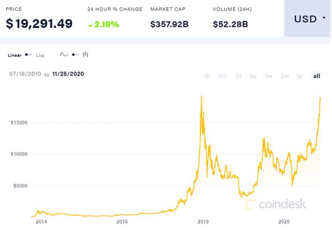 Tối 24/11, giá mỗi đồng tiền số phổ biến nhất thế giới lên sát 19.400 USD, chỉ kém vài trăm USD so với kỷ lục xác lập năm 2017. Năm nay, Bitcoin đã tăng giá gần gấp 3, chủ yếu từ đầu tháng 9.