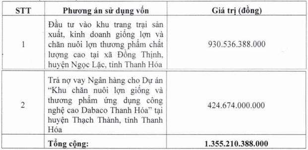 Số tiền dự kiến thu về gần 1.360 tỷ đồng sẽ được trích 930 tỷ đồng sử dụng để đầu tư vào khu trang trại sản xuất, kinh doanh và chăn nuôi heo chất lượng cao tại xã Đồng Thịnh, Ngọc Lặc, tỉnh Thanh Hóa; và dùng 425 tỷ đồng để trả nợ vay ngân hàng cho dự án “Khu chăn nuôi lợn giống và thương phẩm ứng dụng công nghệ cao Dabaco Thanh Hóa”.