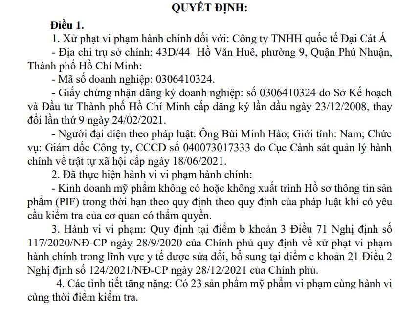 Theo quyết định, Đại Cát Á bị xử phạt vì đã kinh doanh mỹ phẩm không có hoặc không xuất trình Hồ sơ thông tin sản phẩm (PIF) khi được cơ quan có thẩm quyền kiểm tra. Hành vi vi phạm này bị quy định tại điểm c khoản 21 Điều 2 Nghị định 124/2021/NĐ‑CP ngày 28/12/2021.