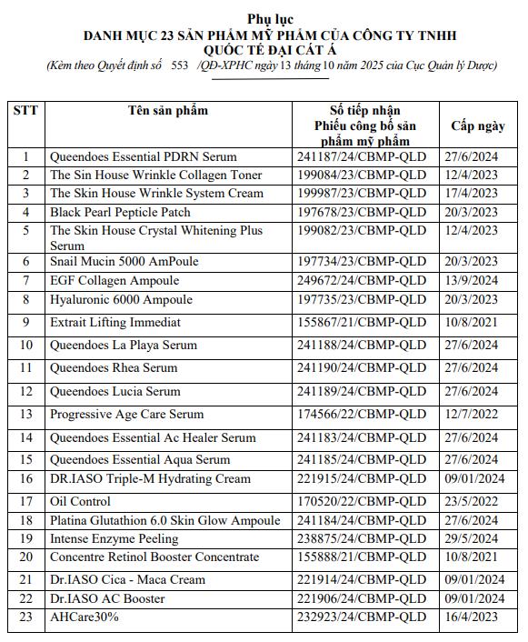 Công ty TNHH Quốc tế Đại Cát Á bị Cục Quản lý Dược xử phạt vi phạm hành chính 75 triệu đồng và buộc tiêu hủy toàn bộ 23 sản phẩm, do vi phạm trong hoạt động kinh doanh mỹ phẩm.