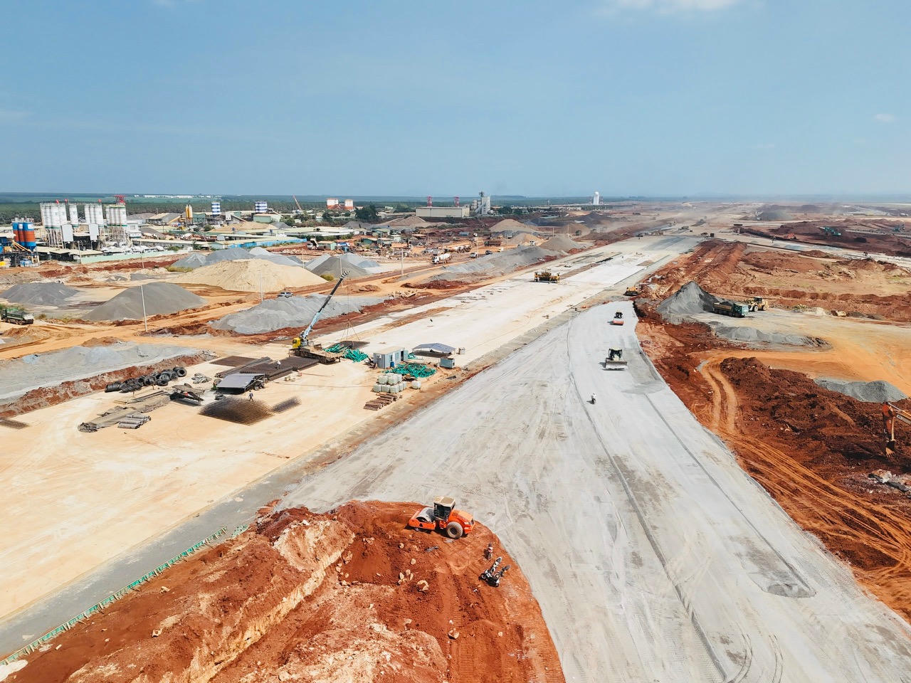 Cách đó không xa, khu vực đường cất hạ cánh thứ hai và sân đỗ tàu bay cũng đang tăng tốc. Xe lu, xe rải bê tông, xe chở vật liệu nối đuôi nhau hoạt động liên tục. Trên công trường, các kỹ sư túc trực kiểm soát cao độ, chất lượng từng lớp nền, bảo đảm yêu cầu kỹ thuật nghiêm ngặt cho hạng mục đặc biệt quan trọng này.