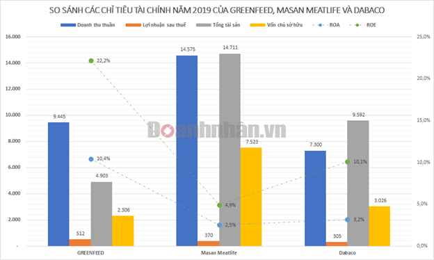 Lép vế về mặt quy mô tuy nhiên lợi nhuận đạt được của Greenfeed lại rất ấn tượng. Khoản lợi nhuận 512 tỷ đồng năm 2019 cho thấy sự vượt trội so với Masan Meatlife và Dabaco với mức tương ứng 370 tỷ đồng và 305 tỷ đồng. Tỷ suất sinh lời trên tổng tài sản (ROA) đạt 10,4% và tỷ suất sinh lời trên vốn chủ sở hữu (ROE) đạt 22,2% đều cao hơn nhiều so với 2 doanh nghiệp trên.