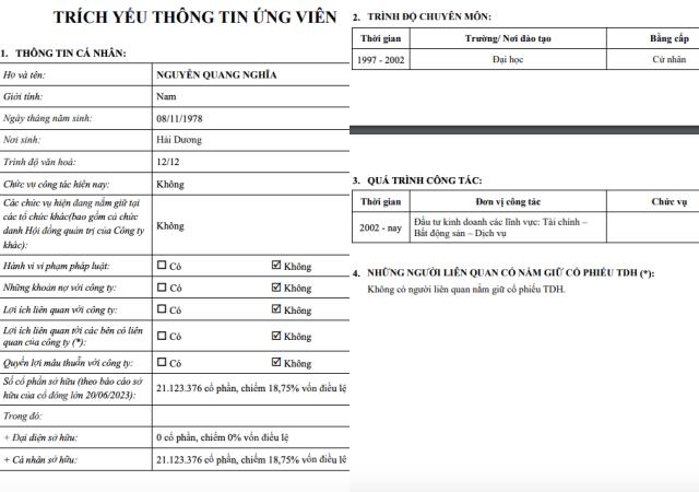 Trong đó, ông Nghĩa đang là cổ đông lớn nhất của TDH với tỷ lệ sở hữu tại ngày 20/06/2023 là 18,75%, tương đương hơn 21 triệu cổ phiếu. Ông Nghĩa được giới thiệu có bằng cử nhân đại học, đã đầu tư kinh doanh các lĩnh vực tài chính, bất động sản và dịch vụ từ năm 2022, ngoài ra không có bất kì thông tin gì thêm.
