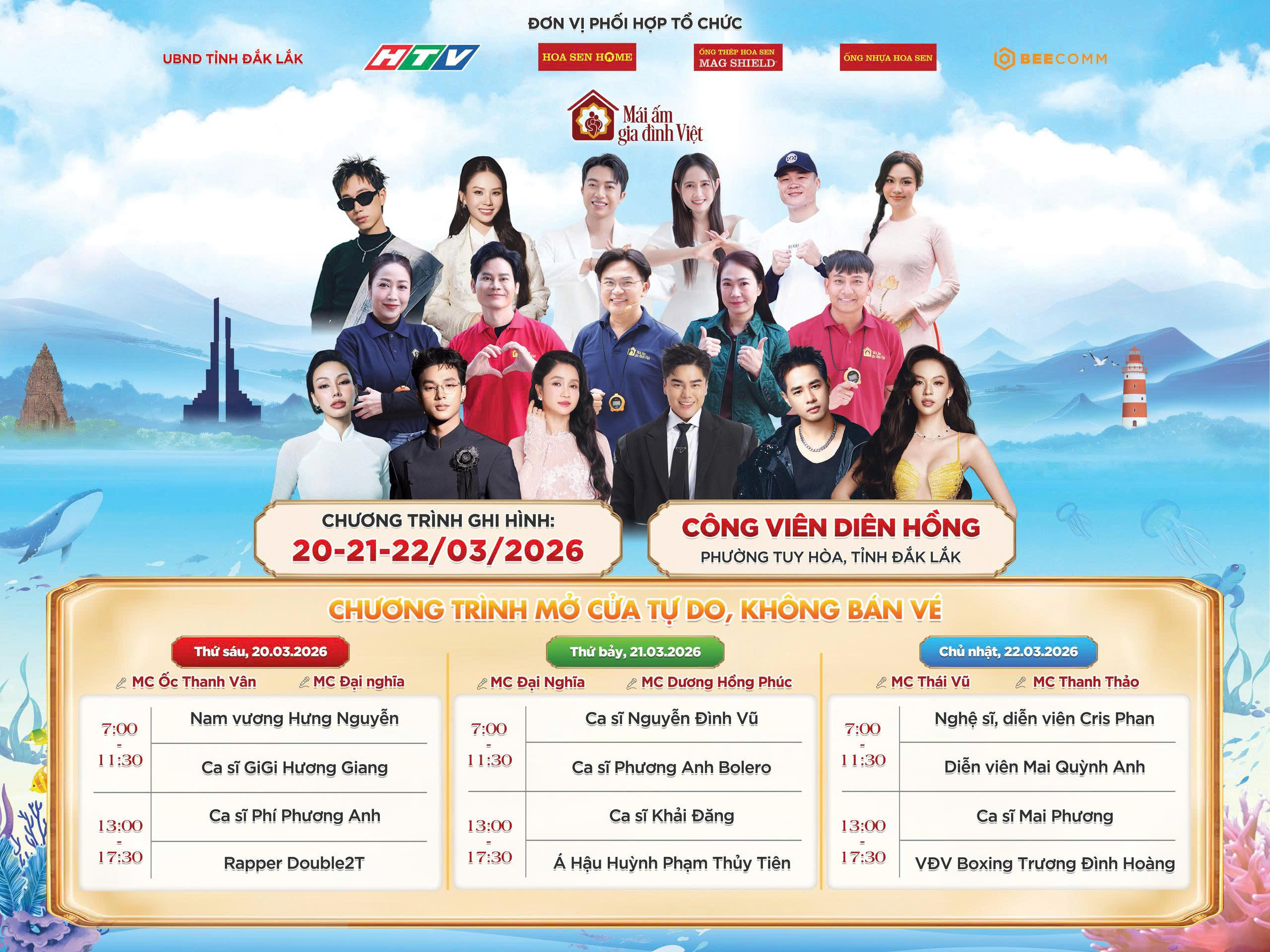 Chương trình Mái ấm gia đình Việt sẽ ghi hình tại phường Tuy Hòa, tỉnh Đắk Lắk trong 3 ngày (20–22/3/2026). Địa điểm ghi hình là Công viên Diên Hồng, số 1 đường Trần Hưng Đạo, phường Tuy Hòa, tỉnh Đắk Lắk.