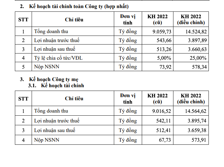 Theo đó, doanh nghiệp sẽ điều chỉnh tăng chỉ tiêu tổng doanh thu hợp nhất cả năm lên 14.525 tỷ đồng và lợi nhuận sau thuế lên gần 3.661 tỷ đồng. So với chỉ tiêu cũ, mức điều chỉnh này tăng 60% (5.465 tỷ đồng) ở doanh thu và tăng 3.147 tỷ đồng lợi nhuận - tức gấp 7 lần kế hoạch cũ.