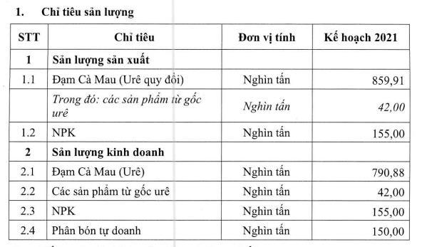 Năm 2021, doanh nghiệp đề ra chỉ tiêu sản lượng kinh doanh Đạm Cà Mau (ure) đạt 790.880 tấn, các sản phẩm từ gốc ure là 42.000 tấn, NPK là 155.000 tấn và phân bón tự doanh 150.000 tấn.
