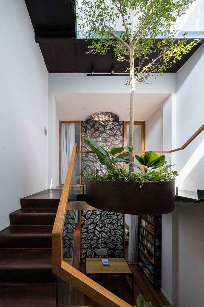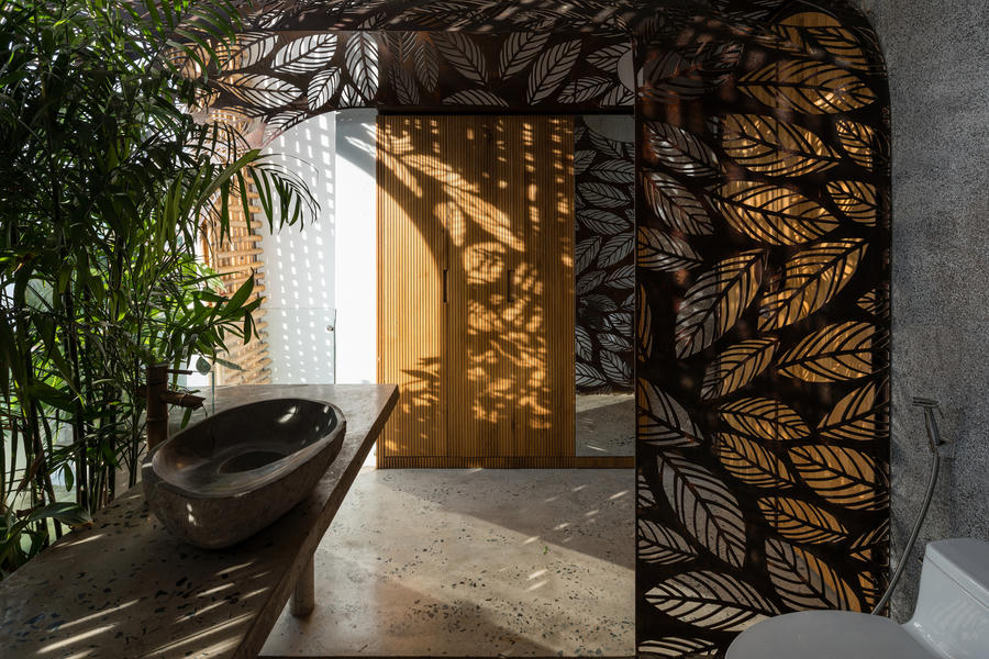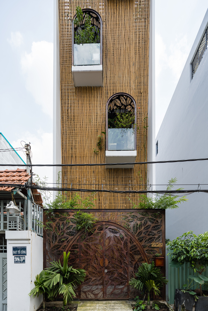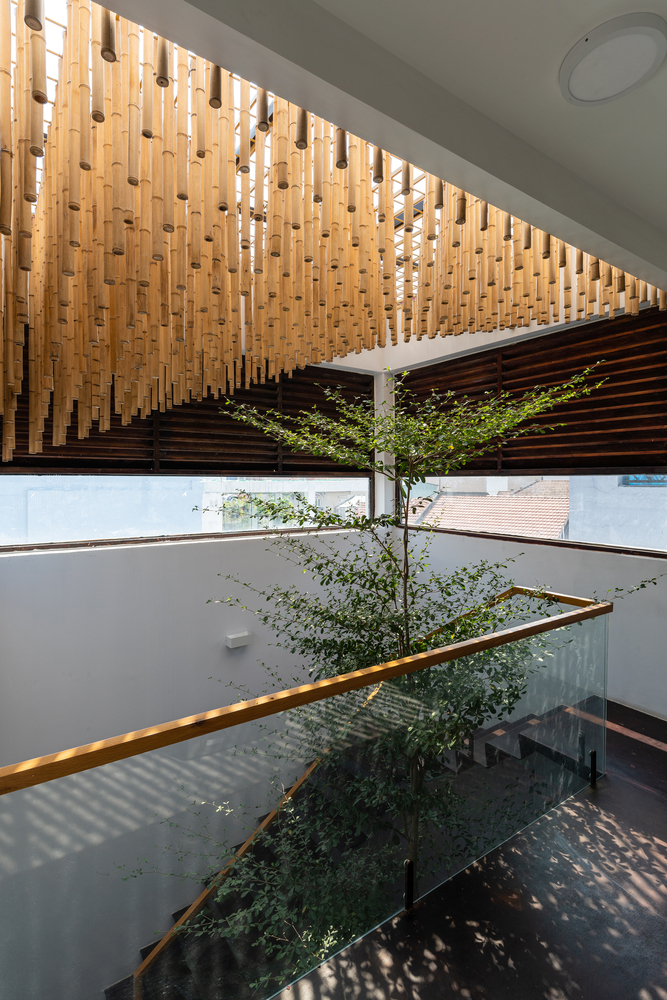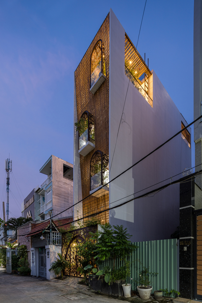 Ngôi nhà Floating Nest (tạm dịch: tổ ấm lơ lửng) được xây dựng trên lô đất rất hẹp (4x12m), bị chắn 3 mặt bởi các công trình lân cận và chỉ có một mặt hướng ra ngoài phía TâyĐể giải quyết những hạn chế trên, đồng thời tăng cường ánh sáng và gió tự nhiên cho ngôi nhà, kiến trúc sư quyết định bỏ hầu hết các bức tường ngăn trong nhà, chỉ sử dụng cây cối và khoảng trống để phân tách không gian.Đồ dùng trong nhà đều ở mức tối giản, ưu tiên sử dụng các vật liệu đơn giản như tre, gỗ, kính, sắt. Trong đó tre là nguyên liệu sẵn có tại địa phương, vừa thân thiện môi trường vừa có hiệu quả kinh tế caoNhững bức bình phong có thiết kế cắt lá đồng nhất có thể được bắt gặp thường xuyên trong ngôi nhà.Ngoài bình phong, kiến trúc sư cũng khéo léo thêm thắt các khu vườn nhỏ để ngăn cách không gianBình phong sắt, mành tre, cửa gỗ và các khu vườn tạo cảm giác không gian "mở"Cầu thang được trang bị những khu vườn nổi nhằm tối đa mảng xanh trong nhàKhông gian phòng ngủ mang lại cảm giác nhẹ nhàng thanh thoát.Trần tre được tạo nên từ những thanh tre thẳng đứng ở khu vực giếng trời, vừa giúp chống nắng lại đem âm thanh vui tai như chuông gióTấm mành tre che chắn mặt tiền của ngôi nhà được cuộn lại ở sân thượng, bao phủ cả khu vườn của gia chủ bên trongÁnh sáng xuyên qua các khe hở của mành tre và cổng sắt khiến Floating Nest về đêm trông như một chiếc đèn lồng ấm áp.