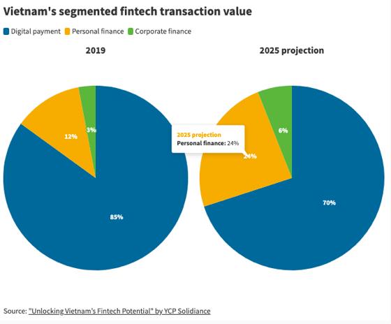 Tuy nhiên, tiềm năng lĩnh vực công nghệ tài chính đang nổi lên ở Việt Nam là rất lớn. Giá trị giao dịch dự kiến sẽ tăng lên 22 tỷ USD trong năm 2025 từ mức hiện tại là 9 tỷ USD. Ở thời điểm này, thanh toán kỹ thuật số chiếm một lượng lớn nhất trong lĩnh vực công nghệ tài chính của Việt Nam.