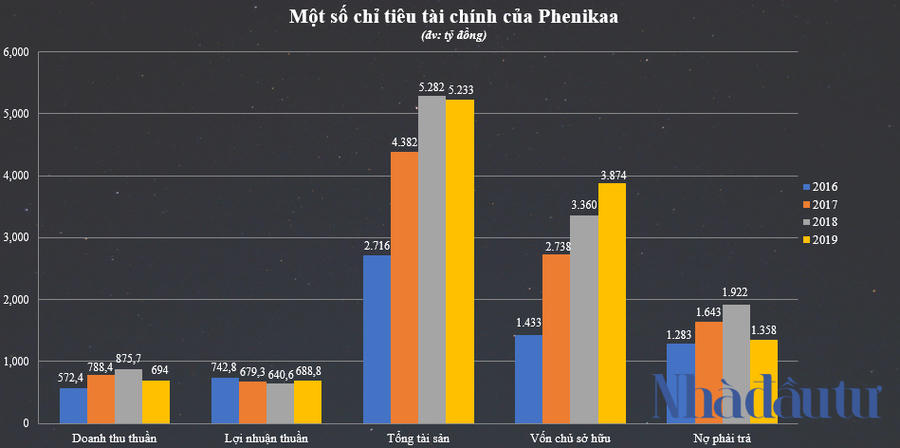 Tại ngày 31/12/2019, tổng tài sản của Phenika ở mức 5.233 tỷ đồng, trong khi đó nợ phải trả là 1.358 tỷ đồng.