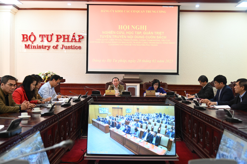 Điểm cầu Bộ Tư pháp do đồng chí Đặng Hoàng Oanh, Phó Bí thư Đảng ủy, Thứ trưởng Bộ Tư pháp và đồng chí Nguyễn Kim Tinh, Phó Bí thư thường trực Đảng ủy Bộ Tư pháp chủ trì.