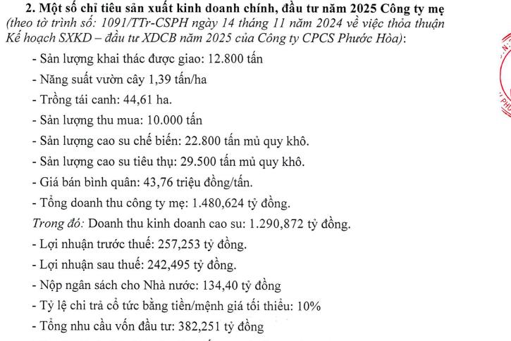 Cụ thể, trong năm 2025, Cao su Phước Hòa đặt mục tiêu doanh thu công ty mẹ đạt 1.480,6 tỷ đồng và lợi nhuận sau thuế dự kiến ở mức 242,5 tỷ đồng, tương ứng lần lượt giảm 3,8% và 23,5% so với năm 2024.