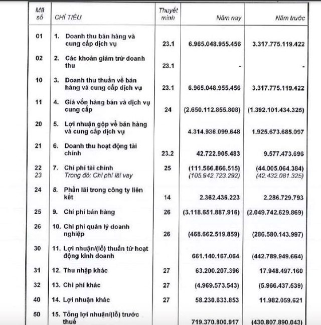 Lợi nhuận gộp đạt 4.314 tỷ đồng, tăng 124% so với cùng kỳ, đây cũng là mức lợi nhuận ghi nhận cao nhất kể từ năm 2014. Trong năm 2022, chi phí bán hàng lên tới hơn 3.110 tỷ đồng, tăng 52% so với năm trước.