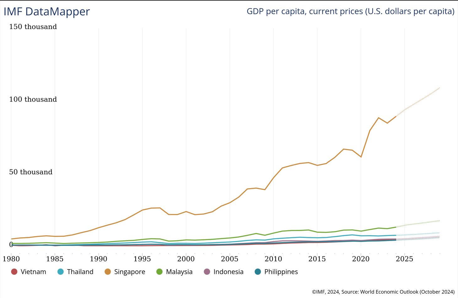 Theo số liệu của IMF, trong năm 2024, GDP bình quân đầu người của Việt Nam được IMF dự báo đạt khoảng 4,65 nghìn USD, tăng gần 300 USD so với 2023, xếp thứ 5 trong khu vực ASEAN-6, sau các quốc gia như Singapore (88,44 nghìn USD) và Malaysia (13,31 nghìn USD), Thái Lan (7,81 nghìn USD) và Indonesia (5,27 nghìn USD). Nếu xét trên toàn thế giới, GDP bình quân đầu người của Việt Nam năm 2024 sẽ ở vị trí 124 trên thế giới.