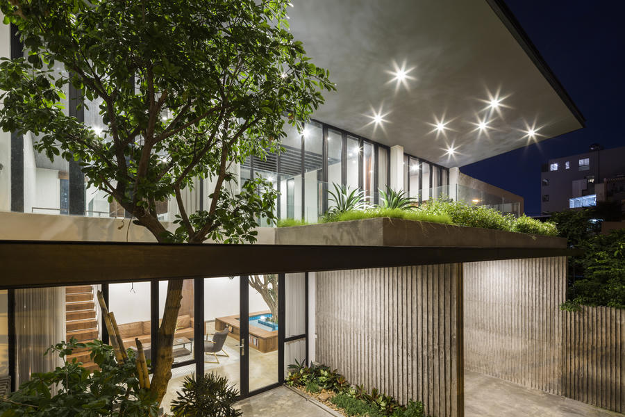 Lô đất rộng 13 m sâu 19 m để xây một biệt thự, xung quanh là sân vườn với nhiều cây xanh. Mặc dù nắng hướng Tây nhưng ngôi nhà có mái hiên đua rộng ra phía trước, thêm các cây lớn và hệ thống cửa cách nhiệt hoàn hảo.
