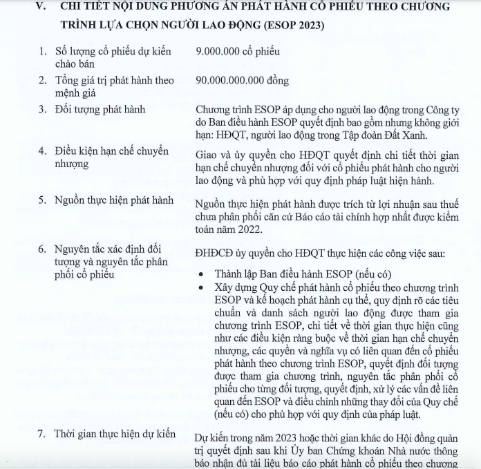Ngoài ra, Tập đoàn Đất Xanh cũng dự kiến chào bán 9 triệu cổ phiếu ESOP, áp dụng cho người lao động trong công ty do ban điều hành ESOP quyết định. Tổng giá trị phát hành theo mệnh giá là 90 tỷ đồng.