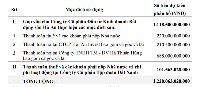 Số vốn huy động được từ đợt phát hành, công ty dự kiến dùng để thanh toán các khoản thuế và nợ tại Công ty con là Công ty cổ phần Đầu tư Kinh doanh Bất động sản Hà An với tổng số tiền phân bổ 1.119 tỷ đồng. Số còn lại 101,5 tỷ đồng, công ty dùng để thanh toán thuế và chi phí hoạt động tại Đất Xanh.