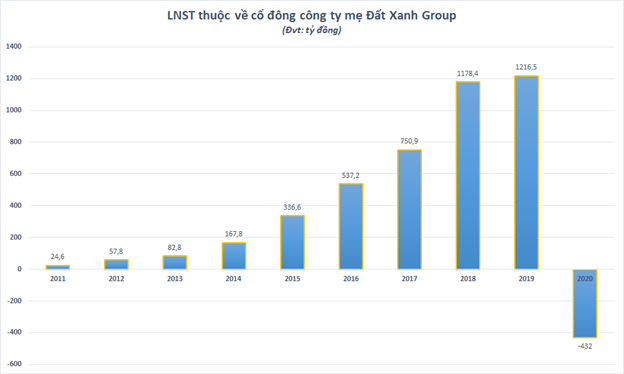 Lũy kế cả năm 2020, Đất Xanh ghi nhận 2.891 tỷ đồng doanh thu, giảm 50% so với năm trước đồng thời báo lỗ 126,5 tỷ đồng sau thuế, trong đó lỗ thuộc về cổ đông công ty mẹ lên đến 432 tỷ đồng.