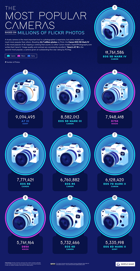Ngoài ra, các mẫu từ iPhone 7 đến iPhone 14 Pro mới nhất chiếm vị trí dẫn đầu ở 62 trên 87 quốc gia. Theo nghiên cứu, về các thiết bị máy ảnh độc lập, Canon EOS 5D Mark IV là thiết bị phổ biến nhất với 11.761.586 tag trên Flickr. Sony đứng thứ 2 với A7 III, có 9.094.495 tag trên Flickr. Nikon đứng thứ 4 với chiếc D750 khi đạt 7.948.418 tag trên Flickr. Phần còn lại của bảng xếp hạng chủ yếu thuộc về Canon, trong khi Nikon và Sony chiếm thêm một vị trí trong danh sách top 10.