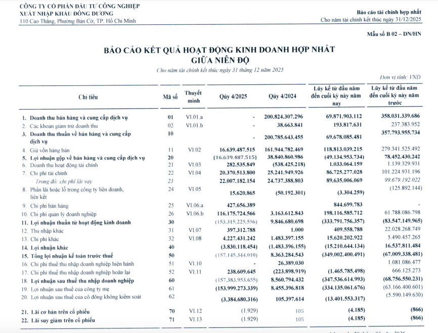 Công ty cổ phần Đầu tư Công nghiệp Xuất nhập khẩu Đông Dương (mã ck: DDG) vừa công bố kết quả kinh doanh quý IV/2025 và cả năm 2025 với con số ảm đạm.