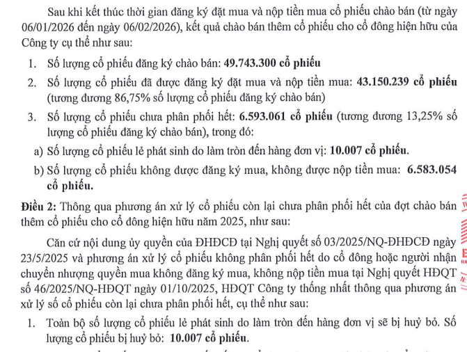 Sau khi kết thúc thời gian đăng ký đặt mua và nộp tiền mua từ ngày 06/01 - 06/02, kết quả có gần 43,2 triệu cổ phiếu được phân phối, đạt tỷ lệ 86,75%.
