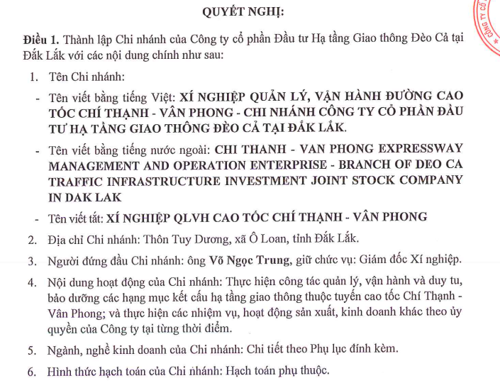 Công ty Đầu tư Hạ tầng giao thông Đèo Cả vừa ban hành Nghị quyết số 04/2026/NQ-HĐQT ngày 9/2/2026 thông qua thành lập Xí nghiệp Quản lý, vận hành Đường cao tốc Chí Thạnh - Vân Phong - Chi nhánh Đèo Cả tại Đắk Lắk.