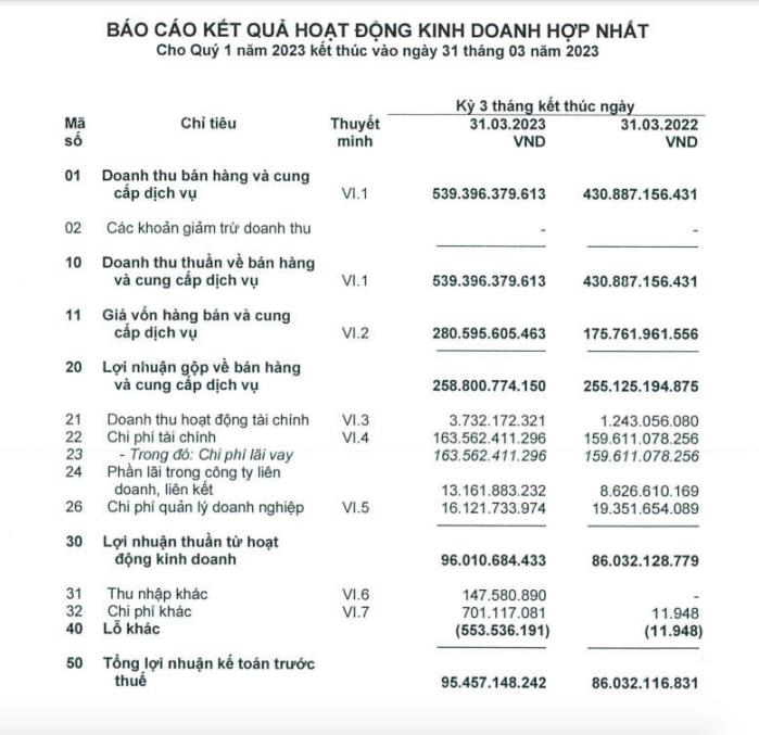 Theo Báo cáo tài chính hợp nhất quý I/2023, Công ty cổ phần Đầu tư Hạ tầng Giao thông Đèo Cả (mã CK: HHV) ghi nhận doanh thu thuần đạt hơn 539 tỷ đồng, tăng 25% so với cùng kỳ.
