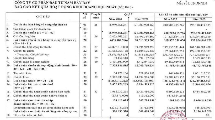 Về hoạt động kinh doanh, quý III/2023, Công ty Năm Bảy Bảy ghi nhận doanh thu đạt 16,94 tỷ đồng, giảm 86% so với cùng kỳ.