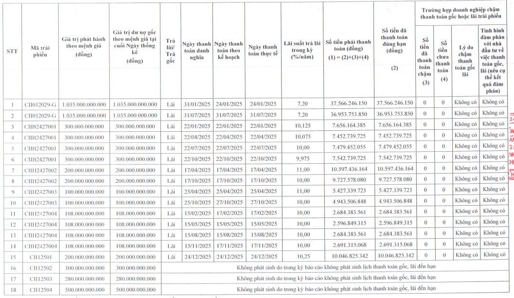 Doanh nghiệp cũng thanh toán hơn 10,3 tỷ đồng lãi của lô CIIH2427003; gần 10,7 tỷ đồng lãi cho lô trái phiếu mã CIIH2427004 và hơn 10 tỷ đồng lãi cho lô CII12501.