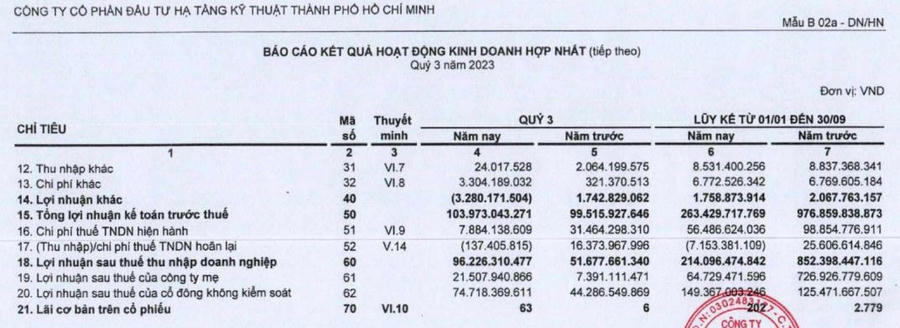 Vốn chủ sở hữu của CII tính đến ngày 30/9 là 8.058 tỷ đồng, giảm so với con số 8.301 tỷ đồng thời điểm 1/1/2023. Lợi nhuận sau thuế chưa phân phối của CII là 2.441 tỷ đồng.