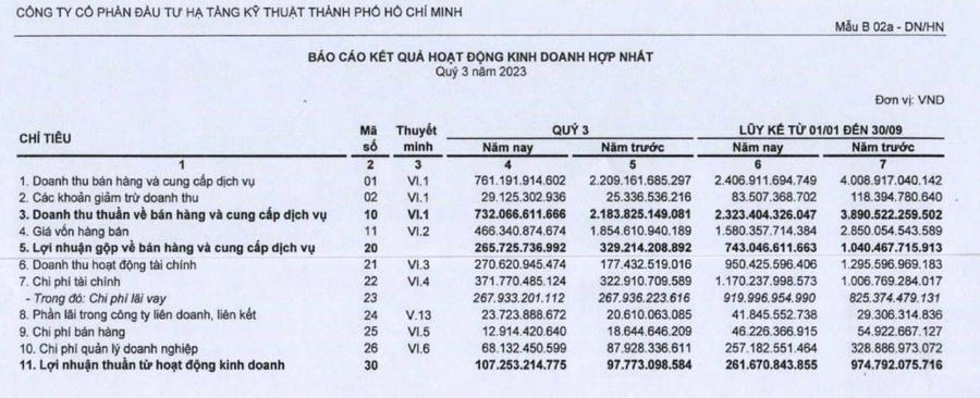 Về kết quả kinh doanh, quý III/2023, Công ty CII ghi nhận doanh thu thuần đạt 732 tỷ đồng, giảm 66,5% so với cùng kỳ. Giá vốn hàng bán sụt giảm mạnh tới 74,8%, lùi về 466,3 tỷ đồng, khién lợi nhuận gộp giảm 19,3% về mức 265,7 tỷ đồng.
