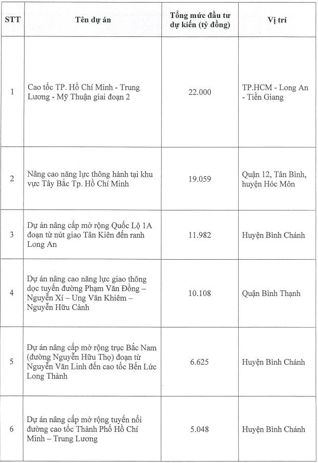 Tiếp đến là dự án nâng cao năng lực thông hành tại khu vực Tây Bắc TP HCM (quận 12, Tân Bình, Hóc Môn) với hơn 19.000 tỷ đồng. Theo sau là dự án nâng cấp mở rộng Quốc lộ 1A đoạn từ nút giao Tân Kiên đến ranh Long An (Bình Chánh) với tổng mức đầu tư gần 12.000 tỷ đồng.