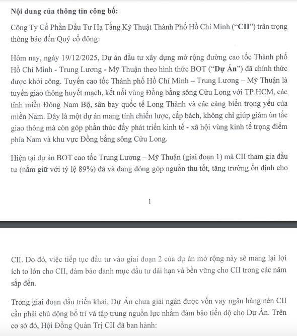 CII mới ra Nghị quyết tạm thời chưa chia cổ tức bằng tiền tại đợt ngày 01/01/2026 và ngày 01/04/2026, nhằm tập trung tối đa nguồn vốn để thực hiện dự án đầu tư xây dựng mở rộng đường cao tốc TP Hồ Chí Minh - Trung Lương - Mỹ Thuận.