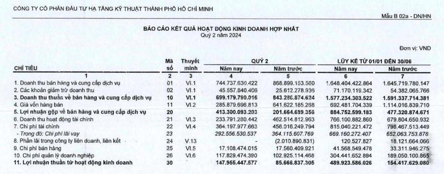 Xét về hoạt động kinh doanh, lũy kế 6 tháng đầu năm 2024, CII ghi nhận doanh thu thuần đạt hơn 1.577,2 tỷ đồng, tăng nhẹ so với cùng kỳ.