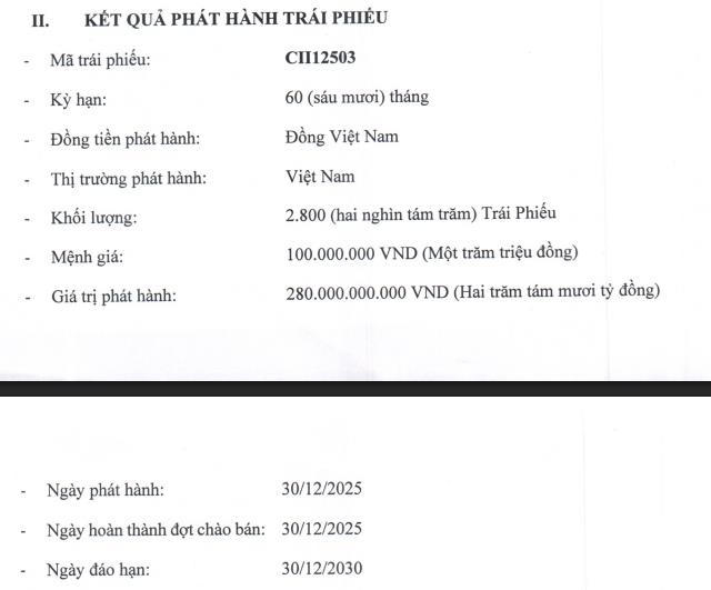 Cụ thể, ngày 30/12/2025, CII đã phát hành thành công 2.800 trái phiếu mã CII12503. Với mệnh giá 100 triệu đồng/trái phiếu, lô trái phiếu có tổng giá trị phát hành 280 tỷ đồng, kỳ hạn 60 tháng, dự kiến đáo hạn ngày 30/12/2030.