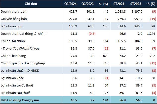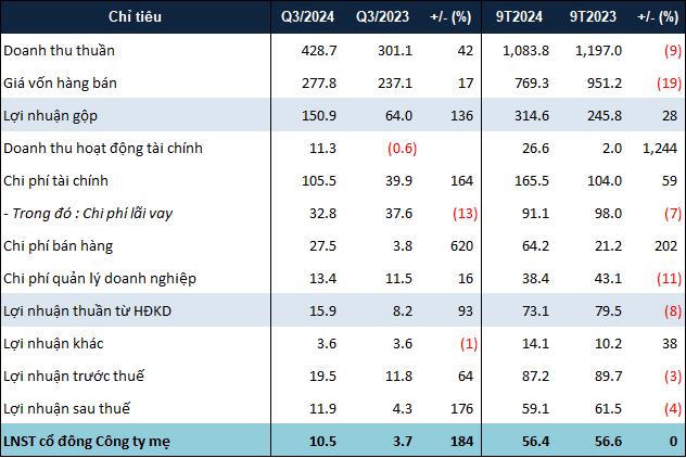 Quý III/2024, Đầu tư Hải Phát ghi nhận doanh thu đạt gần 429 tỷ đồng, tăng 42% so với cùng kỳ. Trong đó, doanh thu từ kinh doanh bất động sản chiếm gần 382 tỷ đồng (tăng 46%), còn lại là từ hoạt động khác.