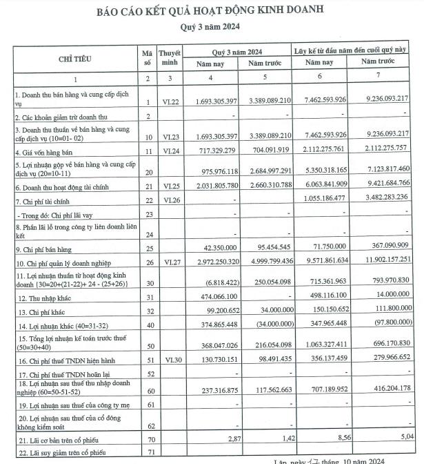 Lũy kế 9 tháng đầu năm, công ty ghi nhận doanh thu thuần đạt 7,4 tỷ đồng, giảm gần 2 tỷ đồng so với con số 9,2 tỷ đồng đạt được ở cùng kỳ năm ngoái. Lợi nhuận sau thuế đạt 707 triệu đồng, tăng 69% so với cùng kỳ năm 2023.