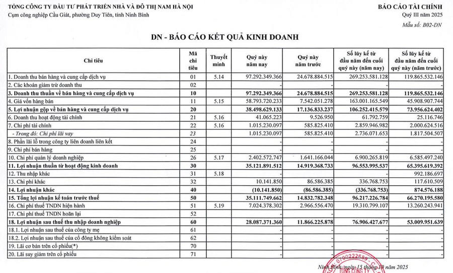 Tổng Công ty Đầu tư Phát triển Nhà và Đô thị Nam Hà Nội (mã ck: NHA) vừa công bố báo cáo tài chính quý III/2025 với doanh thu thuần đạt kỷ lục hơn 97,2 tỷ đồng, gấp gần 4 lần cùng kỳ. Động lực chính đến từ mảng xây dựng công trình hơn 57 tỷ đồng, cùng kỳ không ghi nhận doanh thu; hoạt động kinh doanh bất động sản gần 40 tỷ đồng, tăng 62%.