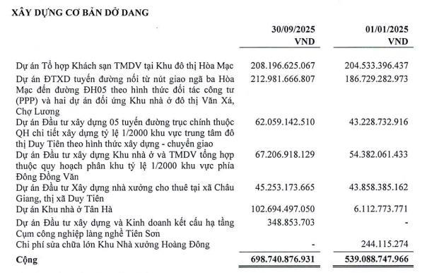 Trong đó, chi phí xây dựng cơ bản dở dang gần 700 tỷ đồng, tăng 30%, chiếm tỷ trọng lớn nhất, tập trung tại dự án tổ hợp khách sạn thương mại dịch vụ thuộc khu đô thị Hòa Mạc hơn 208 tỷ đồng. Dự án đầu tư xây dựng khu nhà ở và thương mại dịch vụ tổng hợp thuộc quy hoạch phân khu tỷ lệ 1/2000 khu vực phía Đông Đồng Văn, thị xã Duy Tiên ghi nhận hơn 67,2 tỷ đồng, tăng gần 24% so với đầu năm.