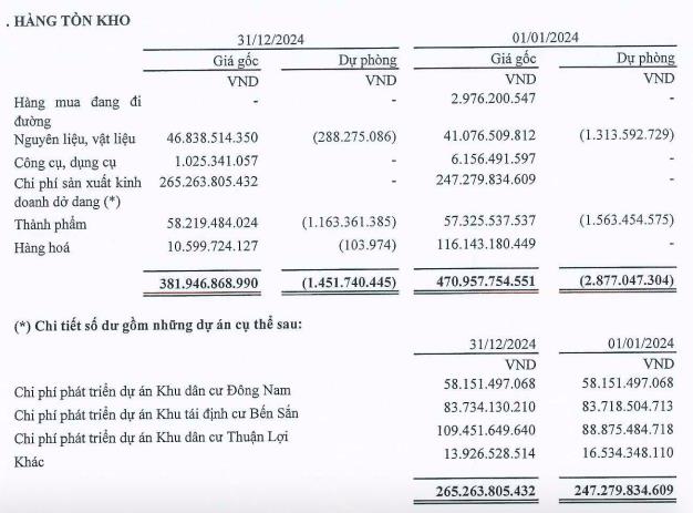 Hàng tồn kho của SIP ghi nhận hơn 381 tỷ đồng, giảm 19%, với phân nửa là chi phí sản xuất kinh doanh dở dang tại dự án khu dân cư Đông Nam (58,1 tỷ đồng), khu tái định cư Bến Sắn (83,7 tỷ đồng) và khu dân cư Thuận Lợi hơn 109,4 tỷ đồng. Chi phí xây dựng cơ bản dở dang tăng nhẹ 1% lên hơn 2.315 tỷ đồng