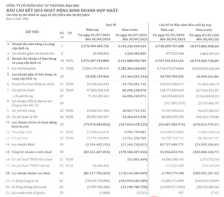 Xét về hoạt động kinh doanh, trong quý III/2024, Đầu tư Thương mại SMC ghi nhận doanh thu đạt 2.276,5 tỷ đồng, giảm 27,5% so với cùng kỳ. Lợi nhuận sau thuế ghi nhận lỗ 82,4 tỷ đồng so với cùng kỳ lỗ 178,15 tỷ đồng.