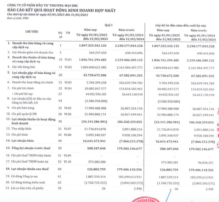 Về bức tranh tài chính, trong 3 tháng đầu năm 2025, SMC ghi nhận doanh thu thuần giảm 17,2%, về 1.846 tỷ đồng, lợi nhuận sau thuế giảm cực mạnh tới hơn 99%, chỉ vỏn vẹn có 126,8 triệu đồng, trong khi cùng kỳ lãi hơn 179 tỷ đồng.