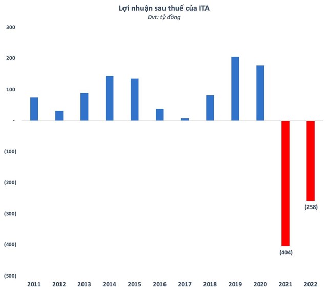 BCTC kiểm toán năm 2022, doanh thu thuần của ITA điều chỉnh tăng nhẹ từ mức âm 1.576 tỷ đồng trên báo cáo tự lập, lên mức âm 1.545 tỷ đồng. Lợi nhuận trước thuế hợp nhất tăng 1% lên mức âm 215 tỷ đồng. Tuy nhiên, lợi nhuận sau thuế hợp nhất lại giảm 81 tỷ (tương đương 46%) so với báo cáo tự lập, xuống mức âm 258 tỷ đồng.