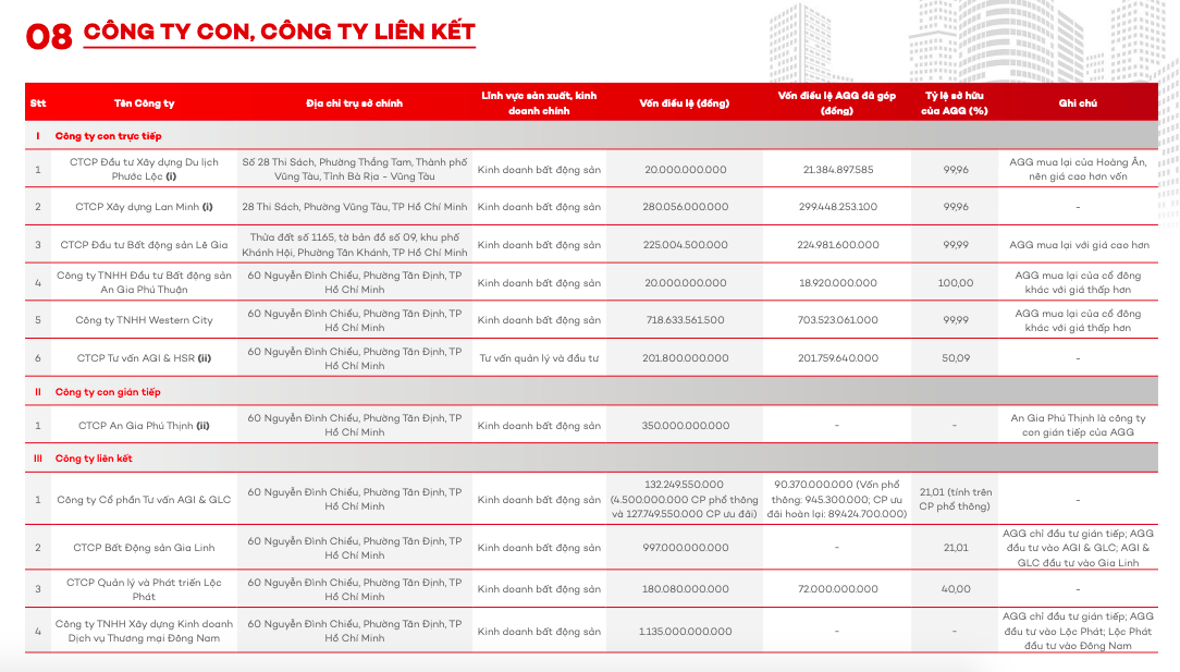 Về phía các công ty liên kết, Công ty TNHH Xây dựng Kinh doanh Dịch vụ Thương mại Đông Nam có vốn lớn nhất lên đến hơn 1.135 tỷ đồng. Ngoài ra, AGG đầu tư trực tiếp và nắm 40% vốn CTCP Quản lý và Phát triển Lộc Phát vốn 180 tỷ đồng. CTCP Bất động sản Gia Linh cũng là một công ty liên kết lớn với vốn 997 tỷ đồng, tỷ lệ sở hữu là 21,01%.