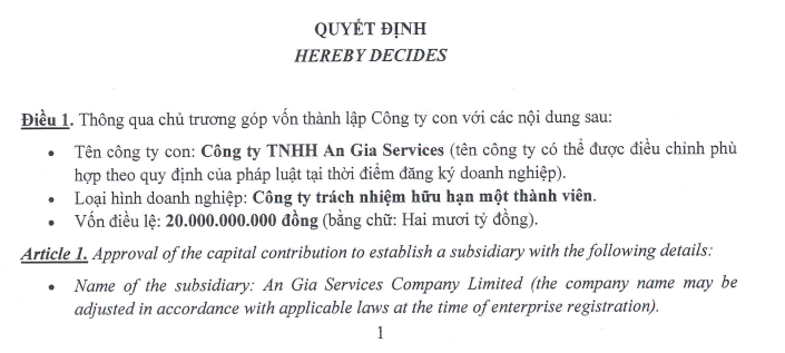 Công ty con mới có tên là Công ty TNHH An Gia Services, hoạt động theo mô hình trách nhiệm hữu hạn một thành viên, với vốn điều lệ là 20 tỷ đồng.