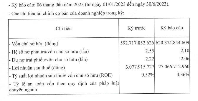 Hệ số nợ phải trả/vốn chủ sở hữu giảm từ 2,55 lần ở cùng kỳ năm 2022, xuống còn 2,1 lần, tương ứng 1.300 tỷ đồng. Trong đó, phần lớn là dư nợ trái phiếu của doanh nghiệp 1.250 tỷ đồng.