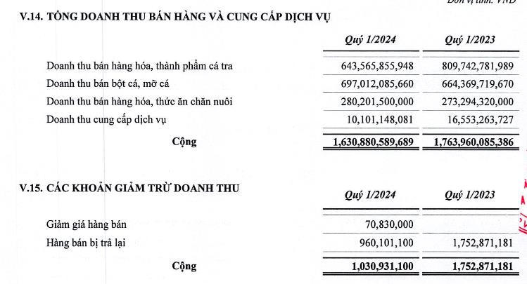 Trong đó, doanh thu từ thành phẩm cá tra và dịch vụ đều ghi nhận giảm, với lần lượt là giảm 20% và 38%, về mức 643 tỷ đồng và 10,1 tỷ đồng.