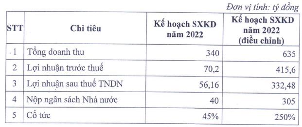 Cụ thể, ĐHĐCĐ nhất trí thông qua điều chỉnh tăng kế hoạch kinh doanh năm 2022. Tổng doanh thu là 635 tỷ đồng và lợi nhuận sau thuế gần 332,5 tỷ đồng, tăng lần lượt 87% và gấp gần 6 lần so với kế hoạch thông qua trước đó. Bên cạnh đó, ĐHĐCĐ điều chỉnh tỷ lệ chia cổ tức từ 45% trước đó lên 250%.